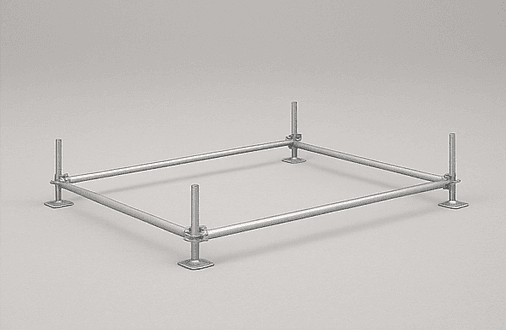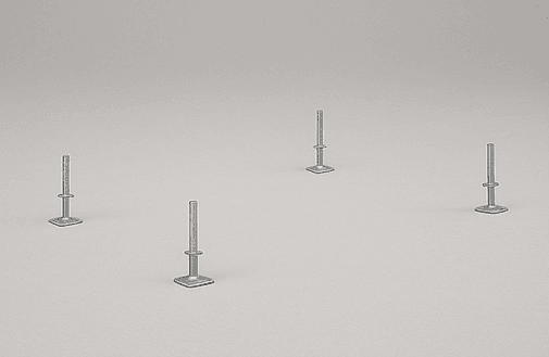 • Fit adjustable bases with collars and loosely place them in position alongside their corresponding ledgers. • Choose the highest ground level as your reference point to simplify future adjustments. • Ensure the screw jack is positioned close to—but not at—the bottom of the thread. This provides maximum range for adjustment on uneven terrain.