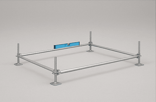 • Use a spirit level to adjust the bases, ensuring the ledgers sit horizontally. • Precise leveling now prevents the need for further adjustments as the structure goes up.