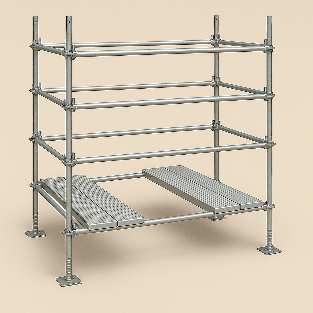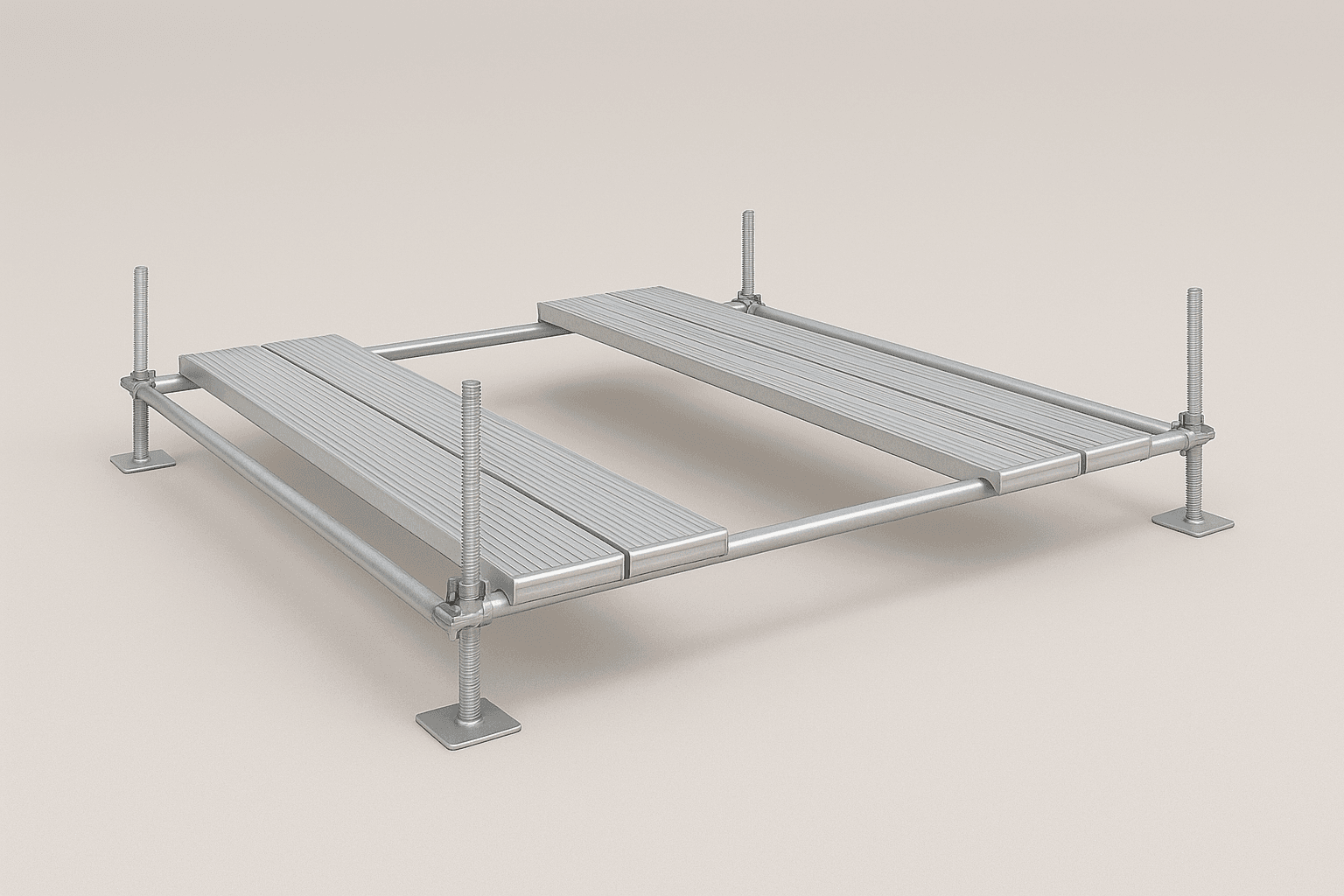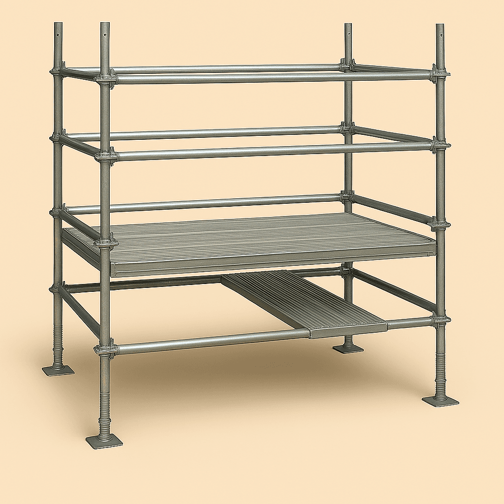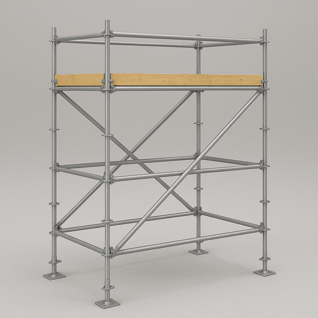 • Inspect All Components: Check bases, ledgers, standards, planks, and braces for damage, wear, or missing parts. • Confirm Ground Conditions: Ensure soil or surface is stable enough to support scaffolding loads, especially on sloped or soft terrain